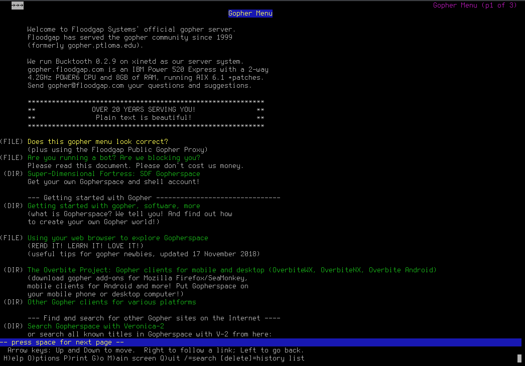Accessing gopherspace is pretty easy. It used to be even easier because web browsers like Firefox supported gopher natively, meaning you could just navigate to a URL and view a page. However, in the case of Firefox this feature was removed in 2011. The easiest way to browse gopher is to use the Floodgap Public Gopher Proxy. This will serve gopher pages through http so they can be viewed just like websites. However, in my opinion this takes some of the fun out of it. The best way to access gopherspace is to use a terminal based browser like Lynx (released in 1992 but still maintained today) to get the true experience. There also exist other terminal based browsers, like Bombadillo, which are capable of browsing other newer text based internet protocols as well, such as Gemini and Finger. In fact, if you are viewing this page with Lynx or the like right now, you can just follow one of the URLs below to start.